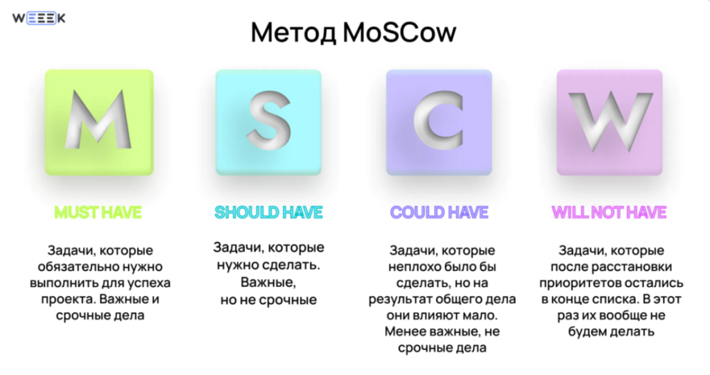 - Должно быть (S, Should Have) — нужная идея, которая выполняется после обязательных задач