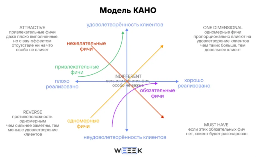 Модель Кано, пожалуй, самый трудный инструмент из перечисленных. Её используют для расстановки приоритетов на основе удовлетворённости пользователей — от частей продукта, функций, приёмов.
