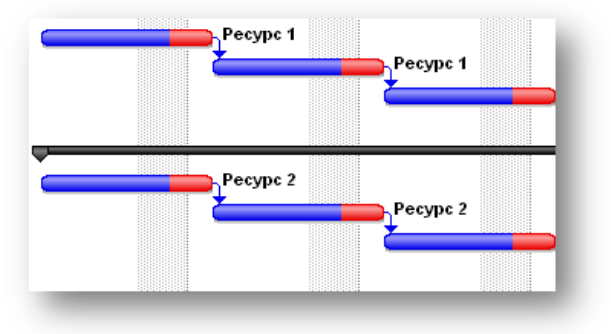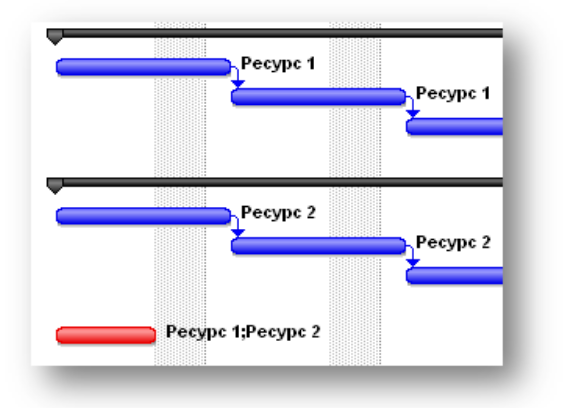 Теперь представим, что мы идентифицировали какой-то риск, который завязан на оба ресурса, но не увеличивает продолжительность работ по решаемым ими задачам. Взгляните на диаграмму ниже: