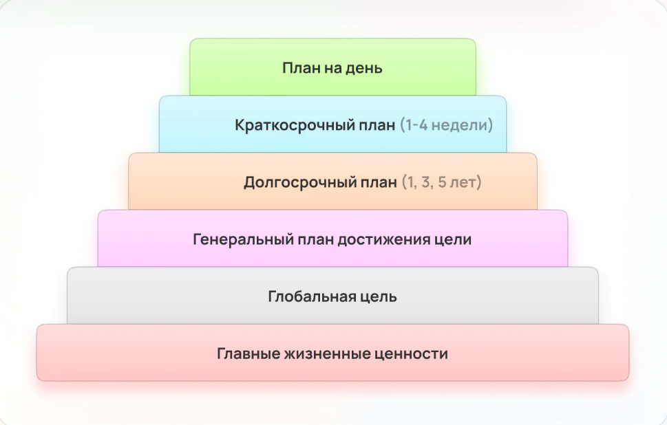 Такой лестнице-пирамиде версии пирамиды наверху — главные жизненные ценности; затем глобальные цели; следом генеральный план по их достижению; дальше — долгосрочный план (на несколько лет); краткосрочный (от недели до месяца) и в самом низу — план на день, на котором всё базируется.